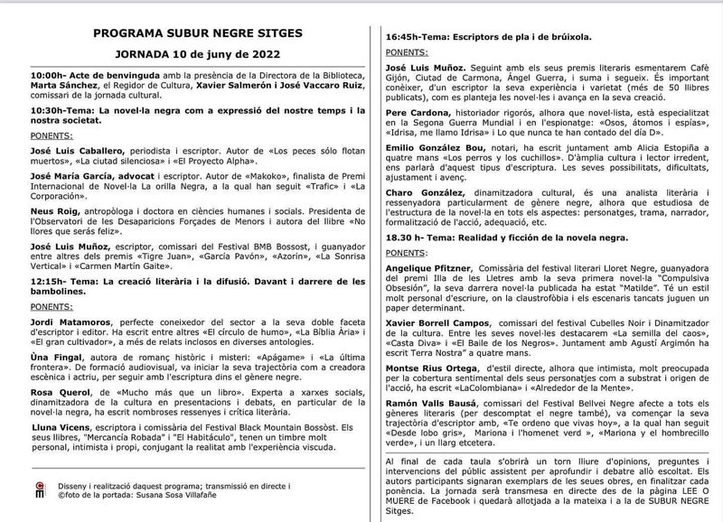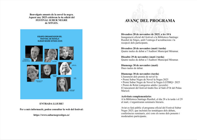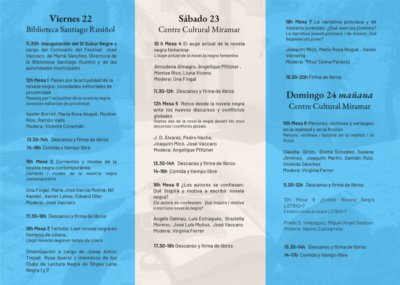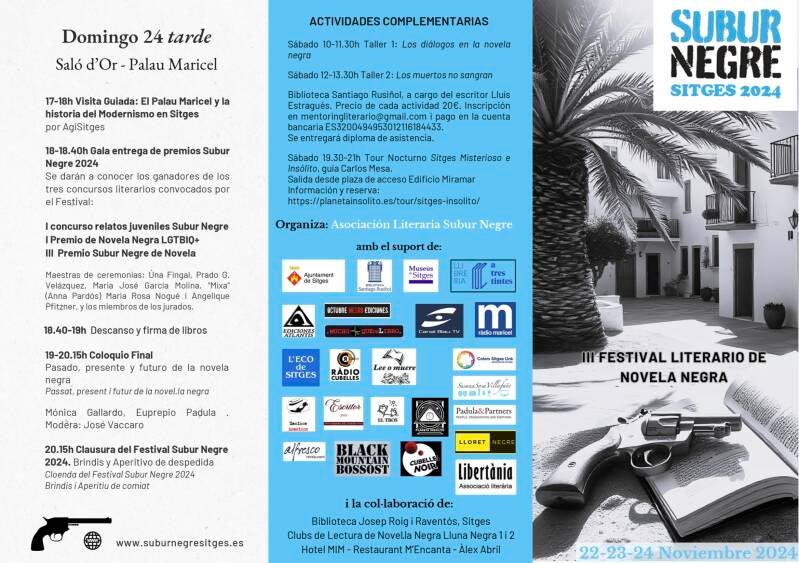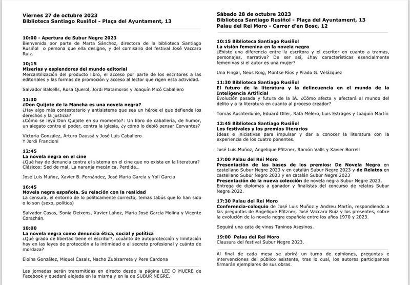 Debates de diversa temática, entorno a la Novela Negra, presentaciones de novedades literarias con la presencia de sus autores. Entrega de PREMIO DE NOVELA NEGRA SNS2024, PREMIO DE NOVELA SUBUR NEGRE LGTBIQ+ y PREMIO DEL CONCURSO JUVENIL DE RELATOS, en castellano, inglés y catalán.